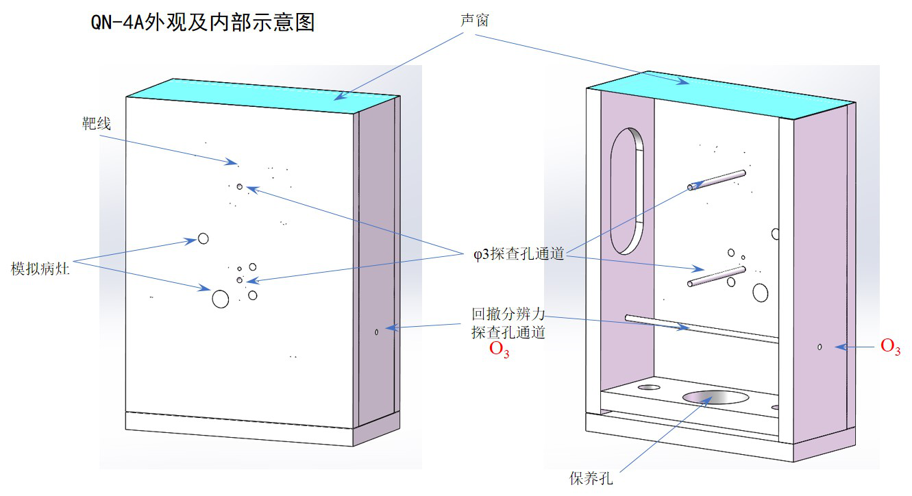 一.概述 KS107QN-4A型腔內(nèi)掃查超聲體模,系超聲傳播特性方面模仿組織的人體物理模型。由超聲仿組織材料(Ultrasonically Tissue-Mimicking Material,簡(jiǎn)稱TM材料)和嵌埋于其中的多種測(cè)試靶標(biāo)(包括靶線、仿囊腫、仿結(jié)石、仿腫瘤)以及聲窗、外殼、指示性裝飾面板等構(gòu)成的測(cè)試裝置。 體模上面板中心位置開(kāi)有兩個(gè)內(nèi)徑為3mm的腔內(nèi)探頭掃查通孔,用以插入腔內(nèi)探頭進(jìn)行超聲掃查,專用于考察配接腔內(nèi)超聲探頭的B超影像裝置的影像特性參數(shù),包括盲區(qū)、側(cè)向(橫向)分辨力、軸向(縱向)分辨力、側(cè)向幾何位置精度、軸向幾何位置精度以及仿病灶的直徑誤差。體模左右側(cè)面板開(kāi)有用于進(jìn)行回撤方向分辨力及回撤方向幾何位置精度測(cè)量的探查孔通道,內(nèi)徑為3mm。體模外觀及內(nèi)部結(jié)構(gòu)示意圖如圖1所示。 二.基本結(jié)構(gòu)