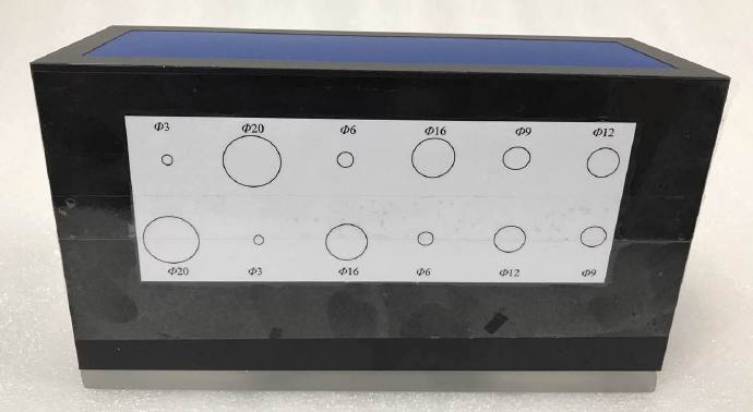 超聲彈性仿組織體模的組成和結(jié)構(gòu)為: (1)全系列包括背景材料相同,但靶標(biāo)不同,彼此獨(dú)立的4臺(tái)體模; (2)體模外殼的側(cè)板和底板均為10mm厚有機(jī)玻璃,頂面覆有復(fù)合薄膜聲窗; (3)底板上開(kāi)有兩個(gè)直徑36mm圓孔,口上封有優(yōu)質(zhì)橡皮,可供注液保養(yǎng)之用; (4)背景材料的尺寸為:長(zhǎng)210mm,寬60mm,高(深)110mm; (5)靶標(biāo)為圓柱形,直徑有6種,分別為Φ3,Φ6,Φ9,Φ12,Φ16,Φ20mm; (6)靶標(biāo)分為上下兩行,軸線分別位于聲窗下30mm和60mm處,沿水平方向間隔一律為30mm,起始靶標(biāo)中心點(diǎn)距離體模邊緣水平距離為40mm; (7)圓柱軸線沿背景材料的60mm方向,與前后殼板垂直,與聲窗表面平行,彼此平行。 (8)各臺(tái)中靶標(biāo)均如表2中所示,按直徑大小交叉排布。